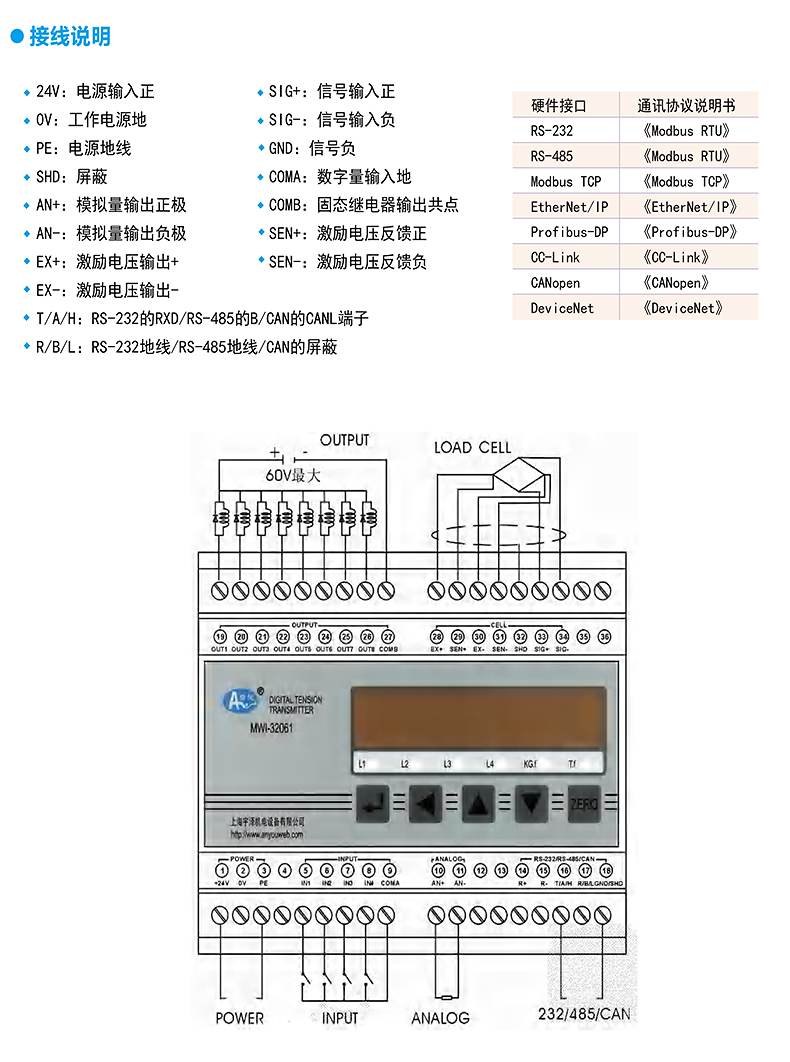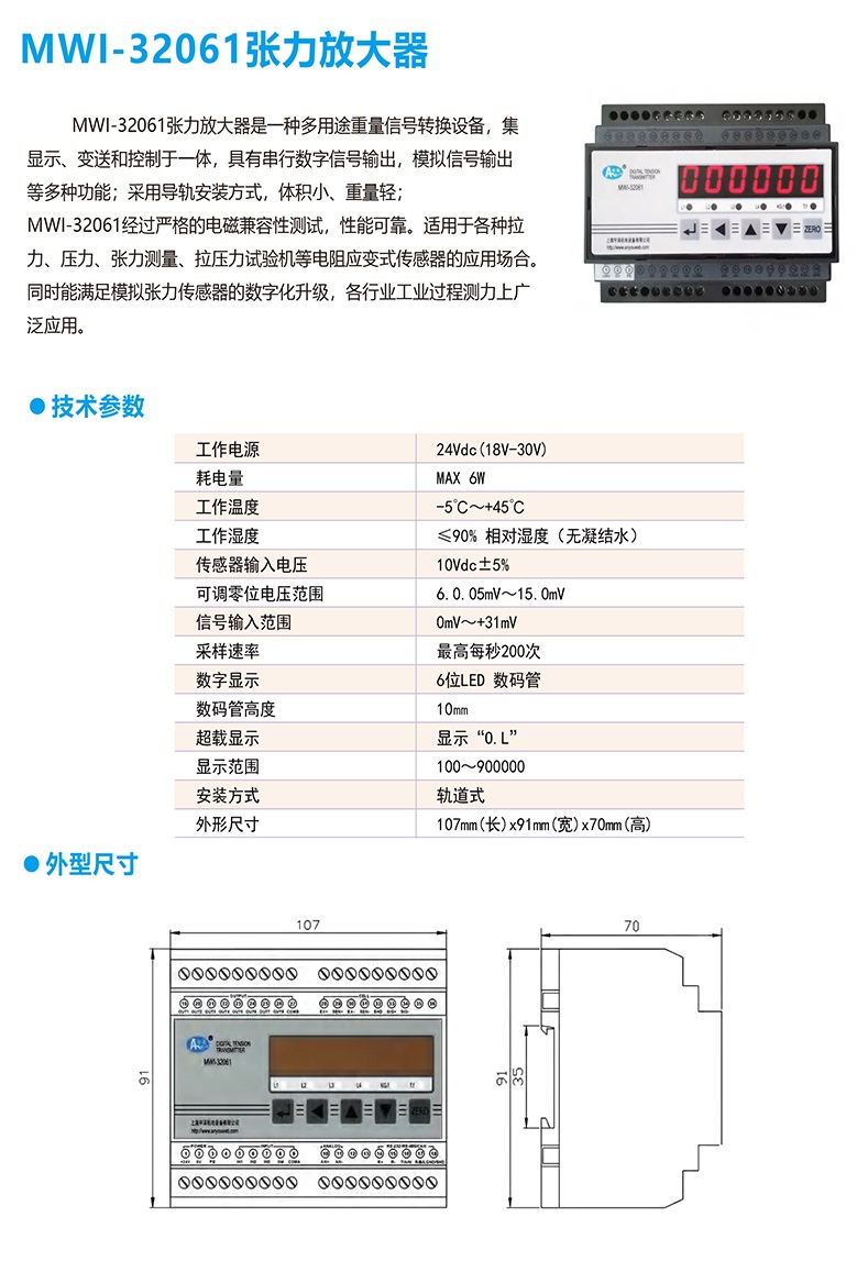 MWI-32061 tension amplifier is a multi-purpose weight signal conversion device that integrates display, transmission, and control. It has multiple functions such as serial digital signal output and analog signal output; Adopting guide rail installation method, with small volume and light weight;