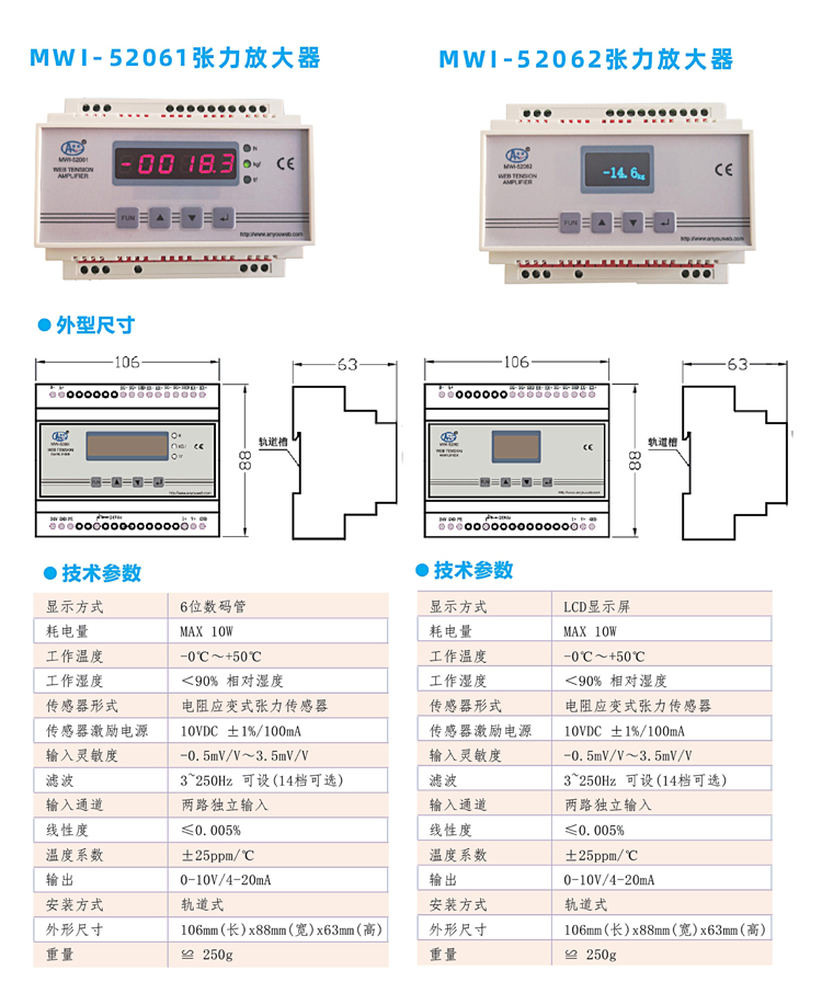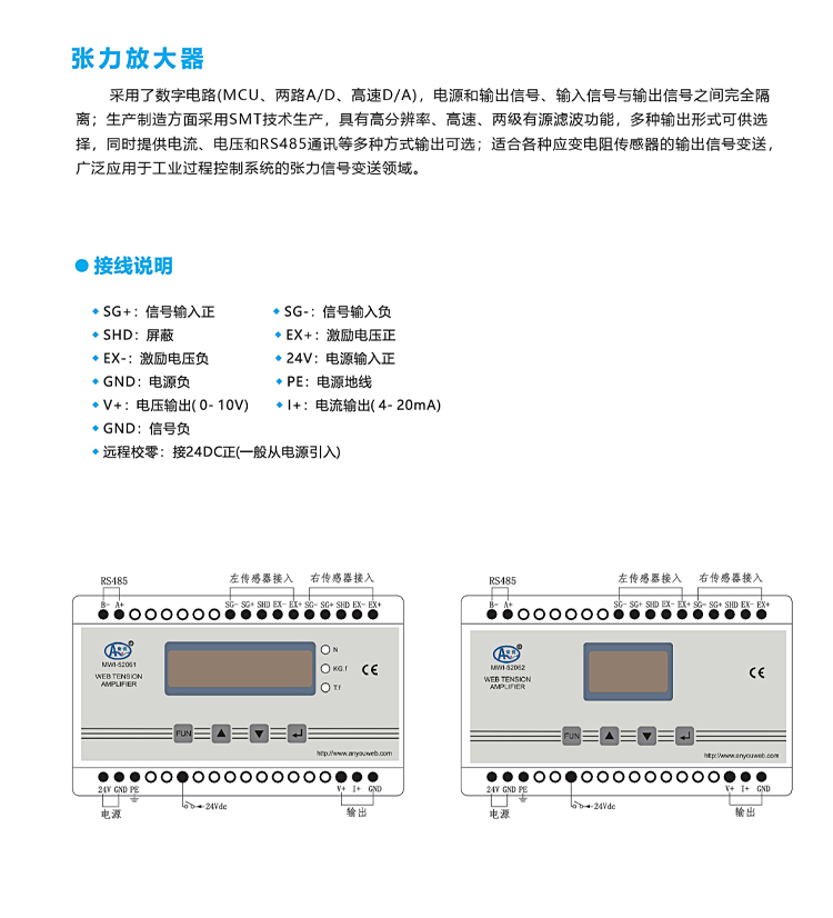 The digital circuit (MCU, dual A/D, high-speed D/A) is used to completely isolate the power supply and output signal, as well as the input signal and output signal; In terms of production and manufacturing, SMT technology is used for production, with high-resolution, high-speed, two-stage active filtering function, and multiple output forms to choose from. At the same time, multiple output modes such as current, voltage, and RS485 communication are available for selection; Suitable for transmitting output signals of various strain resistance sensors, widely used in the field of tension signal transmission in industrial process control systems.